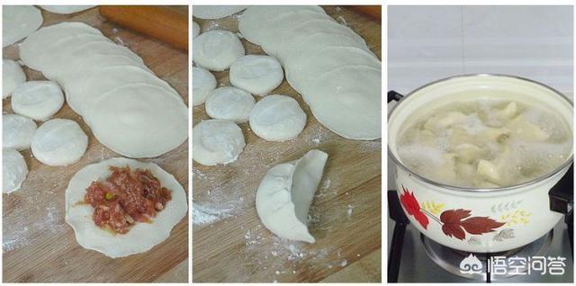 9.锅中水开后放入饺子,大火煮开后两次冲入小半碗凉水,煮至饺子全部浮起即可。