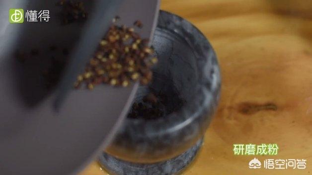 然后锅里放入花椒炒香,研磨成粉,淀粉兑水备用。