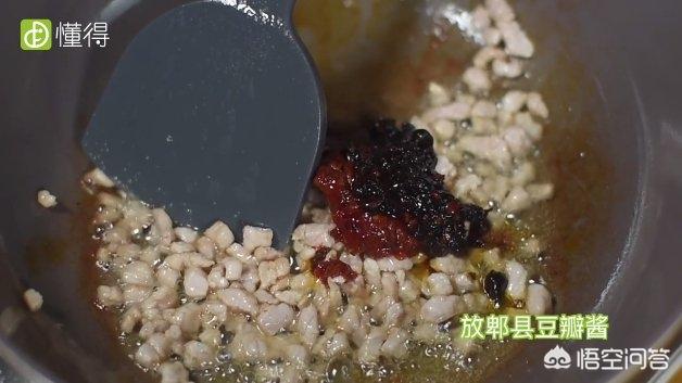 再接着锅里放油,放猪瘦肉粒,放豆豉辣椒酱,放郫县豆瓣酱,翻炒,倒水。