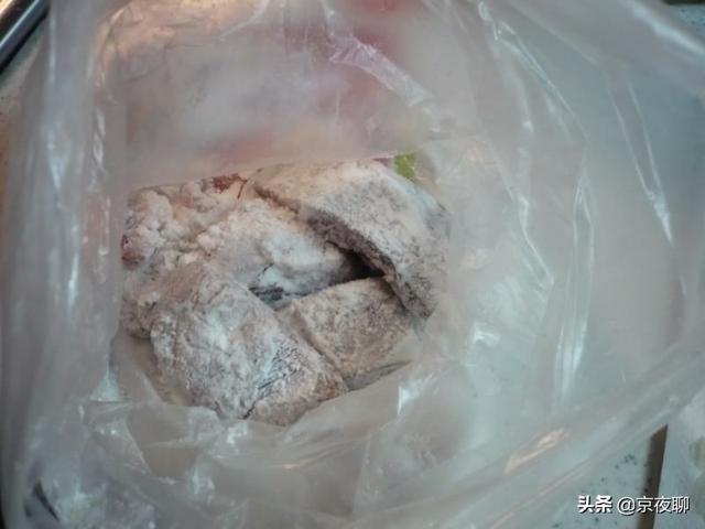 4. 擦去泡好的鲅鱼的汁,切块,塑料袋里加面粉,把鱼块放进袋子握紧袋口,里面留些空气摇晃袋子,使鱼块均匀沾上面粉。裹面粉是我加的,感觉没裹面粉炸鱼炸出来的太硬,在锅里后乱喷油。