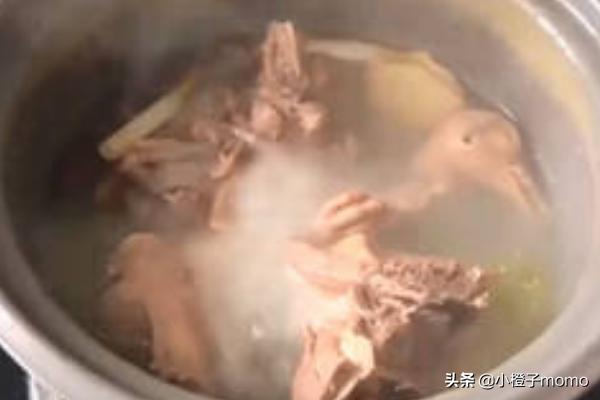 2.放入姜片、冰糖、大枣、葱段,盖上锅盖,小火慢炖一小时。