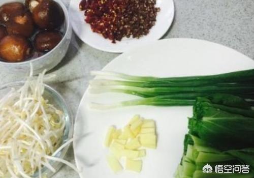 2、这段时间可以把豆芽洗净片,小葱葱白切段葱叶切末,香菇切片辣椒用剪刀剪碎蒜切末,洗好切好待用,如下图所示。