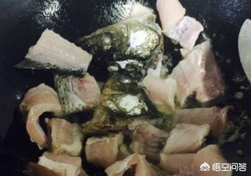 3、把鱼骨鱼头放入油锅煎一下,如下图所示。