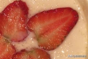 7、第七步、在凝固的双皮奶上放上我们一开始准备的草莓瓣,这样我们的双皮奶就做好了