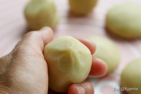 4、当烫面不烫手的时候取出,加2克泡打粉,来回揉搓至光滑细腻,完全没有硬结,有时间饧20分钟。