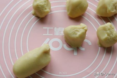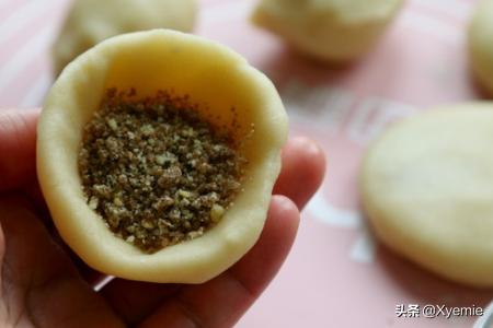 7、取一份按个窝,舀入1茶匙馅料,约5克。