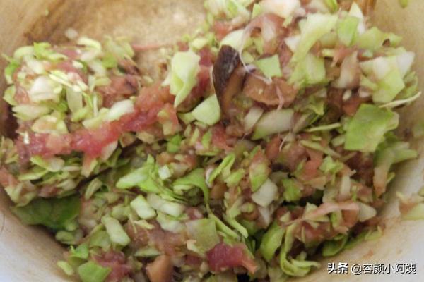 3、再加入泡发后切丁的香菇,卷心菜的菜叶切碎