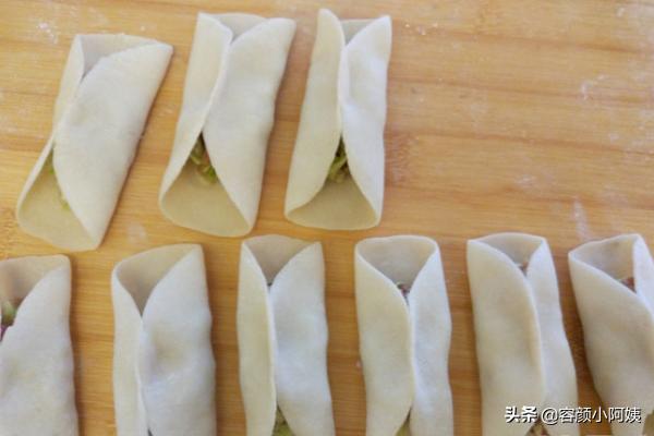 5、馅放在中间,两边面片在顶端捏一下,全都这样包好