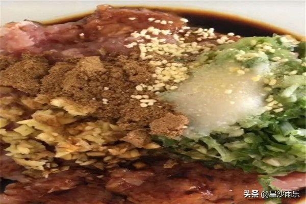2、把肉切碎,加盐、生抽、十三香、料酒、水和玉米油拌匀