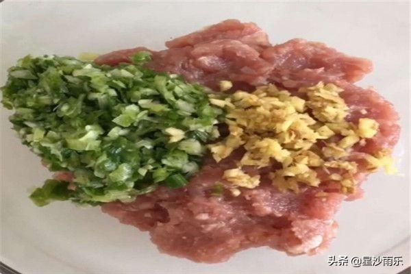 把小葱剁碎、老姜片剁成末。也放入肉馅中。