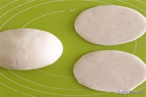 4、将饧好的面团揉匀,揉成长条,切成大小相当的剂子,压成饼,擀成薄片