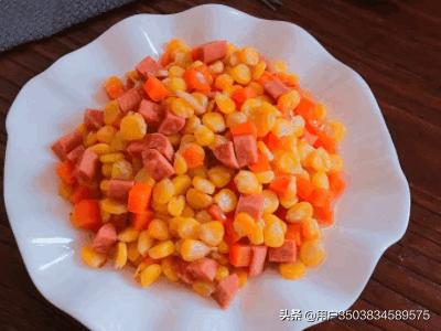 做法:将胡萝卜和火腿肠切成玉米样大小的颗粒,起锅烧油油热后倒入蒜末爆香;然后胡萝卜和玉米粒一起下锅,加入盐和调料;炒至八分熟放入火腿丁,翻炒即可出锅。