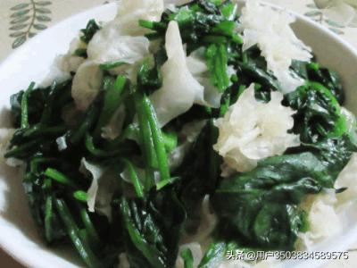 做法:将已泡发的银耳去根清洗清洗捞出;将菠菜下入沸水中焯一下捞出,用清水过凉并放在案板上切开;起锅倒油烧热,下入银耳翻炒;加入切好的菠菜翻炒;最后加入适量的盐、味精炒匀即可。