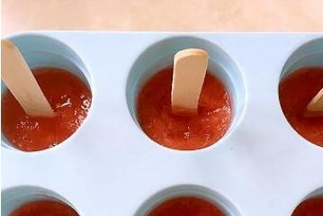 4、2个多小时后,取出模具,西瓜汁冷冻的凝固些,插上棒冰棍,棒冰棍能够直立不倒即可,如果倾斜证明西瓜汁没冷冻到位,还得冷冻一会,将插好棒冰棍的模具继续放冰箱冷冻2个小时,让西瓜汁冻硬,如下图所示。