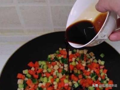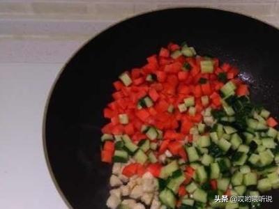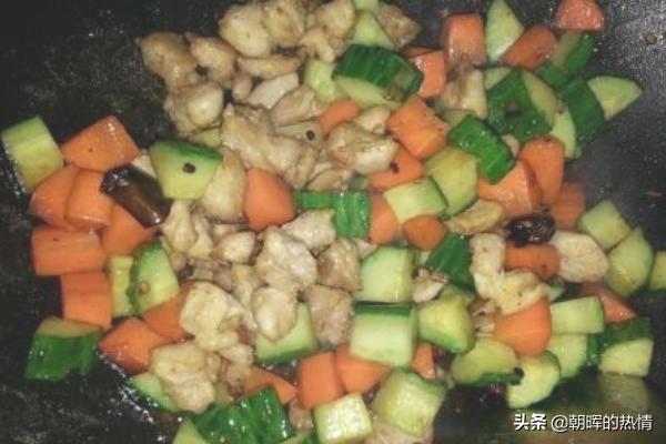 1、首先把花生米炒熟备用(稍微变色即可出锅)。黄瓜、胡萝卜洗净,和鸡肉一起切丁;鸡丁用1勺料酒腌好去腥,将生抽、醋、糖按上述量调好备用。