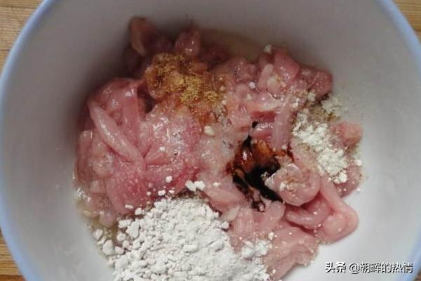 1、首先将鸡胸肉洗净切丁,装入碗中。然后加入一勺盐,一个蛋清,少许淀粉,少许料酒,一勺生抽,一勺食用油,然后用手抓匀,冷藏腌制14分钟。