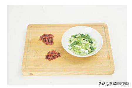 4、青蒜择好,清洗后切成3.3厘米长短的青蒜段,备用,干辣椒用剪子剪成小段,备用。