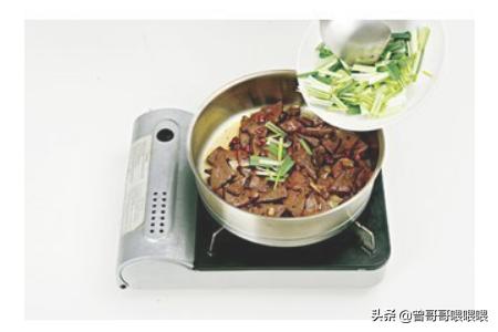 6、待油温生6、7成热后,下入蒜丁、姜丁、干辣椒段,煸出香气后,放入豆豉再一同煸炒。煸炒至干辣椒变色,滑入猪肝,反复翻炒,大约10秒后,猪肝变色,下入青蒜和鸡精,再次翻炒30秒,待猪肝表面炒出弹性,略略变硬,快速点入香油,出锅即可。