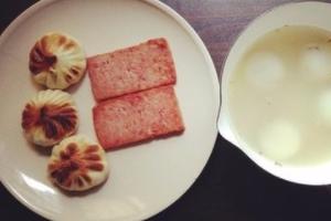 周四早餐:生煎包子、米酒汤圆、粉肉香肠,切片或块,加上苹果片或香蕉片及其它水果片均可搭配。