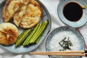 周日主食:火烧或生煎包子,加稀饭,咸菜,加碟生抽酱油姜蒜汁作为备用蘸料,作为学生的调味品。再配加水果或蔬菜,如圣女果或黄瓜片。