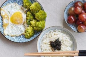 周五早餐:主食紫菜清汤条,加一个煎蛋、西兰花几朵,水果加提子或葡萄,其它水果均可,根据孩子需求也可选用蔬菜类。