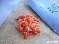 5、胡萝卜切成和玉米一样大的颗粒状,虾仁也切成同样大小的颗粒。