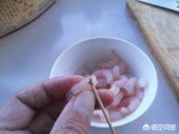 4、把虾去头去壳开背后去虾线,虾头留着待用,把虾仁装进碗里,倒入半勺料酒和和小半勺食盐腌制10分钟