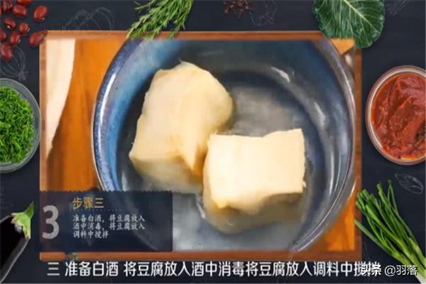 4.准备白酒,将豆腐放入酒中消毒将豆腐放入调料中搅拌。