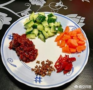 3.胡萝卜、黄瓜洗净切小方丁,小红辣椒切段去籽,备花椒,郫县豆瓣酱切碎备用