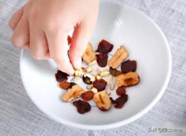 ?4、找个干净碗,碗里面刷层油,核桃仁,花生仁、葡萄干,豆子同时放入碗中,红枣、山楂条依次摆好。