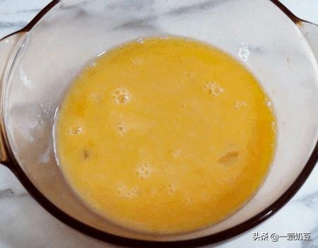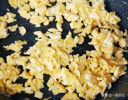 5、起油锅,油温6成时将打散的蛋液倒入平底锅中,小火力煎蛋,待蛋液凝固后将蛋饼用铲子铲碎。