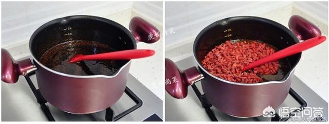 小火,不停的搅拌,熬至锅中冒着黏稠的密集的小泡泡,并能闻到香浓的红糖味,加入枸杞翻拌拌匀