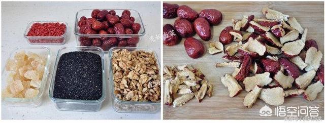 配料:黄酒500ml,冰糖400克,红枣500克,核桃500克,黑芝麻500克,枸杞200克。