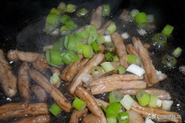 4、热锅熟油,下肉条煸炒,倒少许酱油,使肉入味,然后放葱圈炒一下。