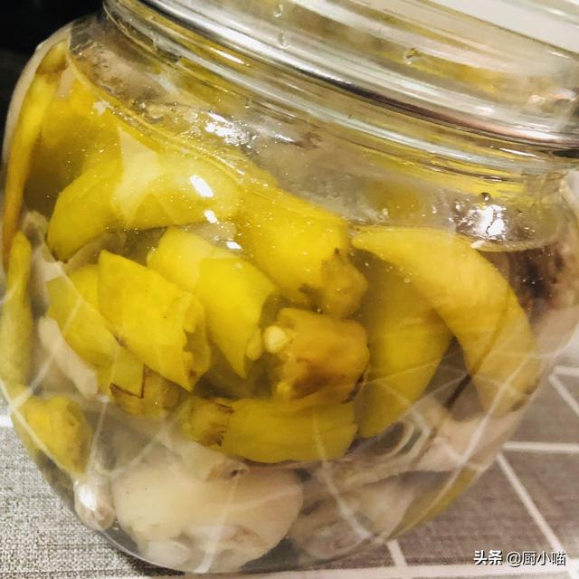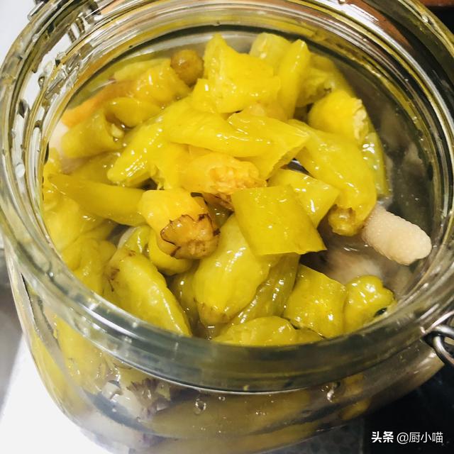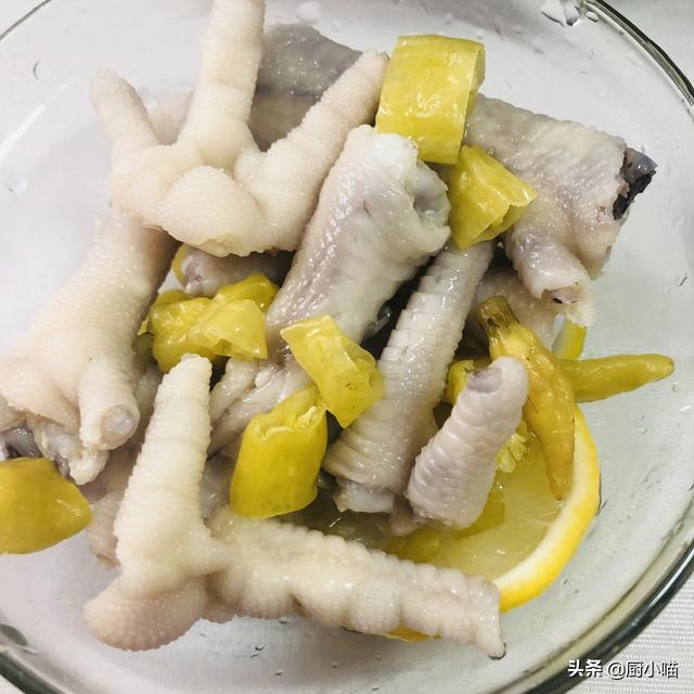 4、从冰水中捞出一定要把鸡爪水分晾干!然后把泡椒倒入密封罐,泡椒可以选择切断,然后?凉白开?两勺盐?一勺糖?两勺白醋?白酒少许,泡椒水与凉白开比例大约1:1