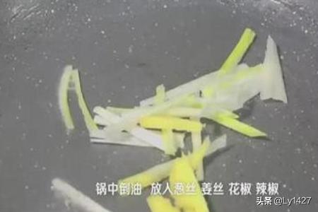 3、锅内倒油,放入葱丝、姜丝、花椒、辣椒、郫县豆瓣酱爆香。