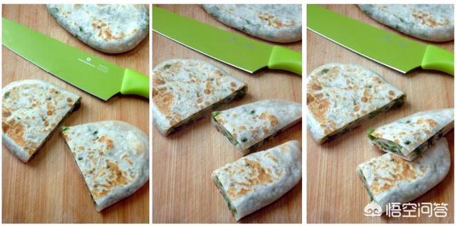烙好的饼切开,摆放在盘里,就可以享用了。