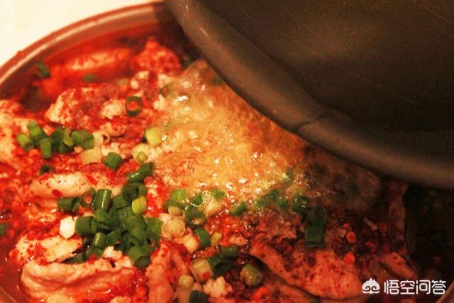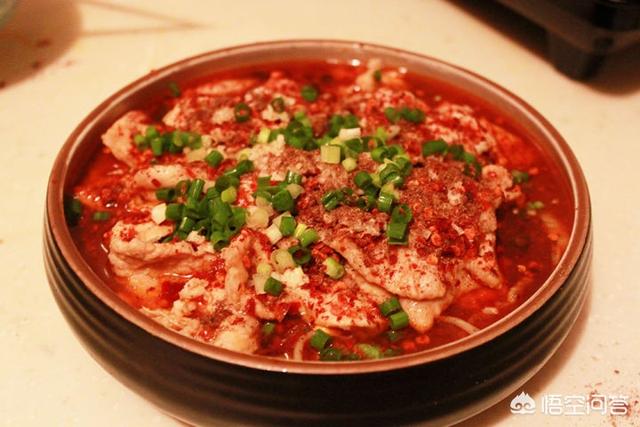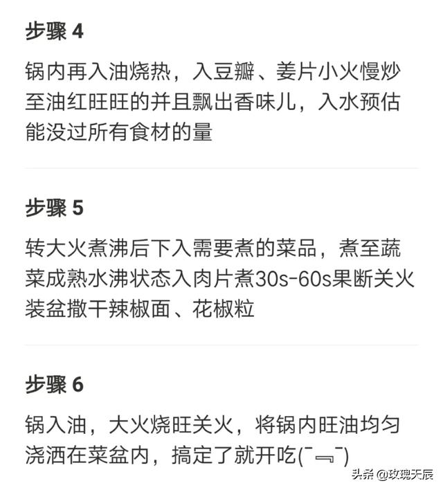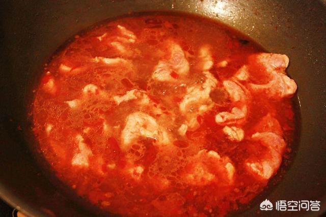 三;坐锅烧油,放葱姜蒜,麻椒,干辣椒炝锅,再放郫县豆瓣酱炒出红油,加水或高汤,调味,放入菜底,汤开后吧菜捞出放碗低,再放入腌好的肉片,一定小火。肉片一变色就捞出来,要不然就老了,影响口感,再把汤倒入碗里,洗锅烧油,最好加点藤椒油。