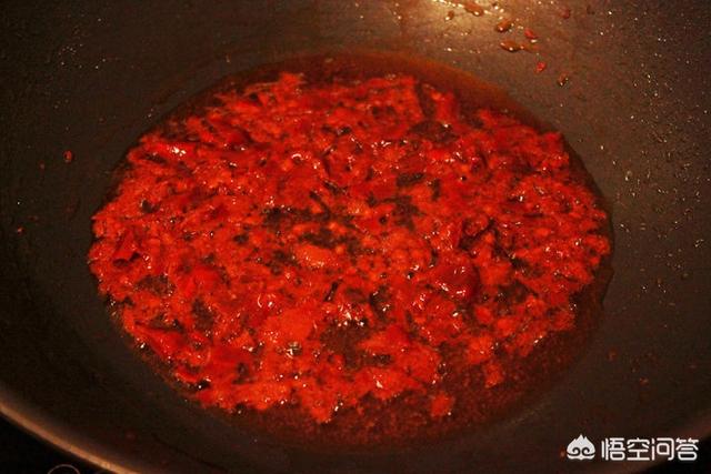 锅要烧热,倒油,油温要低,否则豆瓣酱要糊,放入一大勺豆瓣酱,用小火慢慢炒,这个步骤很重要,只有用油炒,才能更好的发挥出豆瓣酱的颜色和香味。