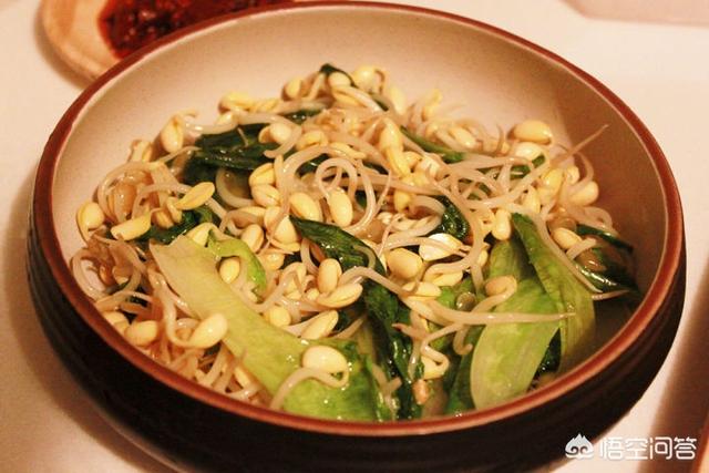 然后来做配菜,豆芽、油麦菜、凤尾、蒜苗、金针菇,等等容易熟的素菜,都可以,简单加点盐,炒熟就可以了。用清水煮熟也可以。