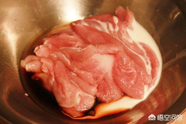 一;准备一块猪里脊,切成片,放盐,料酒,鸡蛋清,淀粉,少许胡椒粉,少许老抽,拌匀放置一边备用。