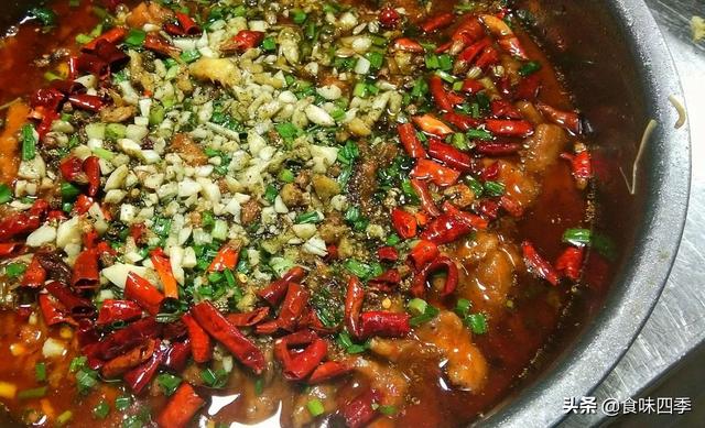 6.锅内热油将火锅底料各种辣椒撒下,开锅后,料渣捞出。