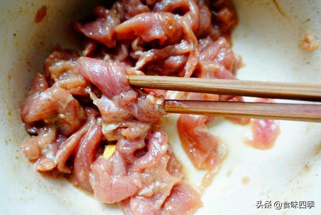 步骤一:先把里脊肉切成薄片,用清水冲洗干净,挤干肉片中的水分,加适量盐、生抽、料酒、蛋清和生粉抓拌均匀备用。