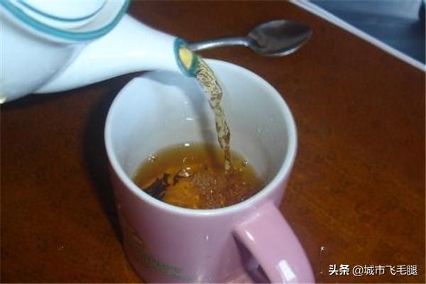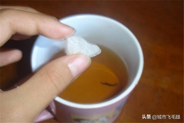 5、等冰糖在茶中慢慢融化,茶放凉后,放一片大约2毫米的柠檬片,一分钟后就可以喝了。如果家中碰巧没有柠檬,也可以用白醋(半勺)代替,不过口感稍逊。