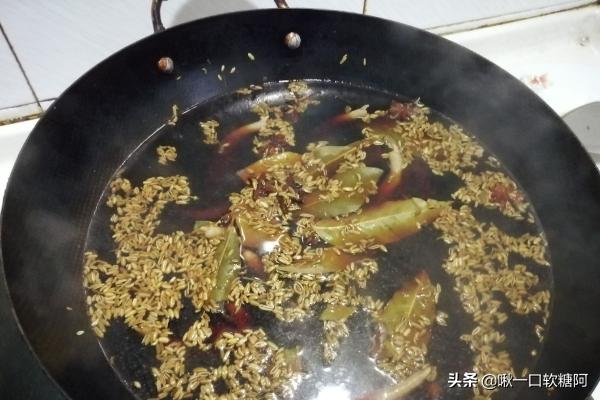 3.锅底加清水7斤,然后加入老母鸡和猪大骨,煮制90分钟,既成鲜汤,在加入所有的辣椒、麻椒、香料、姜片、葱段、食用油,小火煮90分钟(中途把葱段捞出),最后加入所有的调味料,卤水就做好了。