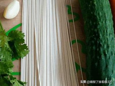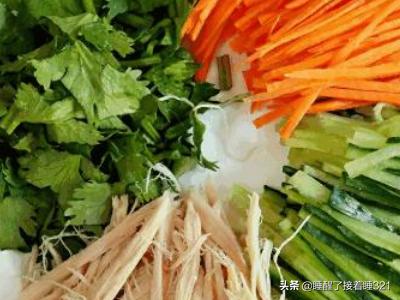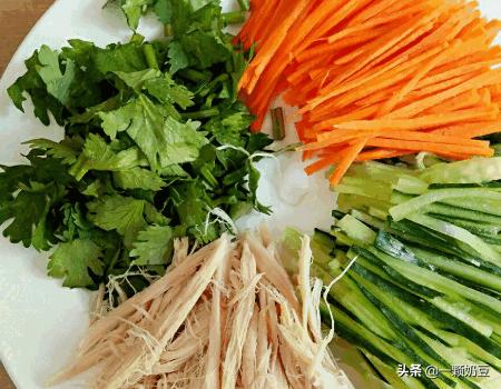 2、鸡胸肉入开水煮熟晾凉,撕成细丝;黄瓜,胡萝卜切细丝,香菜切小段。