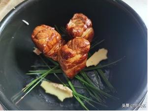 鸡蛋下锅之后再将红烧肉烧60分钟,这一步的目的是将五花肉烧熟烧至入味,在烧制第50分钟的时候将葱结和姜片捞出,再将鸡蛋捞出放入盘中垫底备用