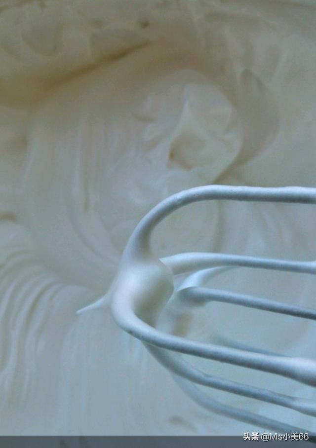 将吉利丁液加入打发的蛋清中,高速打发到出现明显花纹