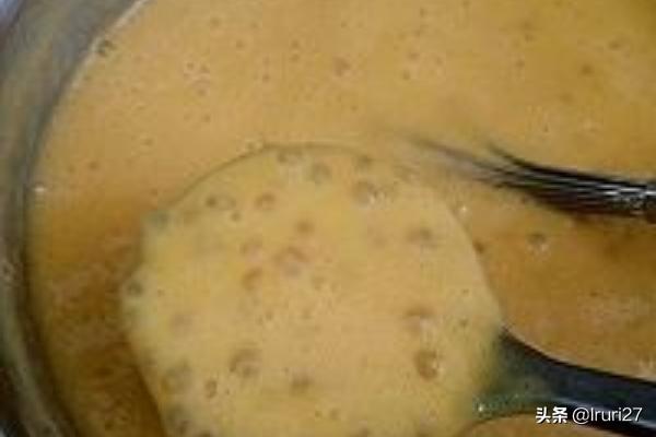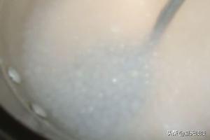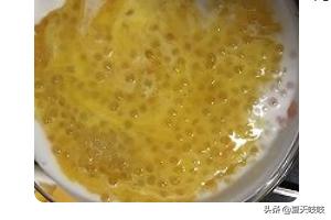 5、当西米降到40℃以下时,先加入淡奶,分量以汤色泛起牛奶色为准;再加入椰浆,分量以闻到椰香而定。