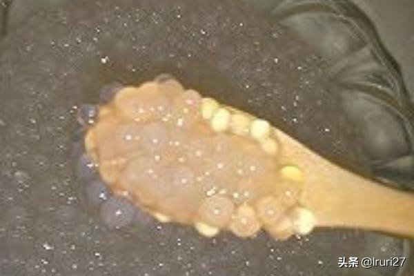 1、西米放进煮开的水里,大火煮1分钟后加盖闷至透明(约20分钟),用过滤筛子盛着用凉水冲净,沥干后备用。